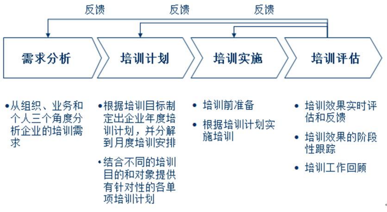 培訓(xùn)實(shí)施體系則包含了確保企業(yè)培訓(xùn)制度實(shí)施,并通過培訓(xùn)活動的有效組織和落實(shí)、跟蹤和評估、改善和提高從而體現(xiàn)培訓(xùn)價(jià)值的一整套控制流程。