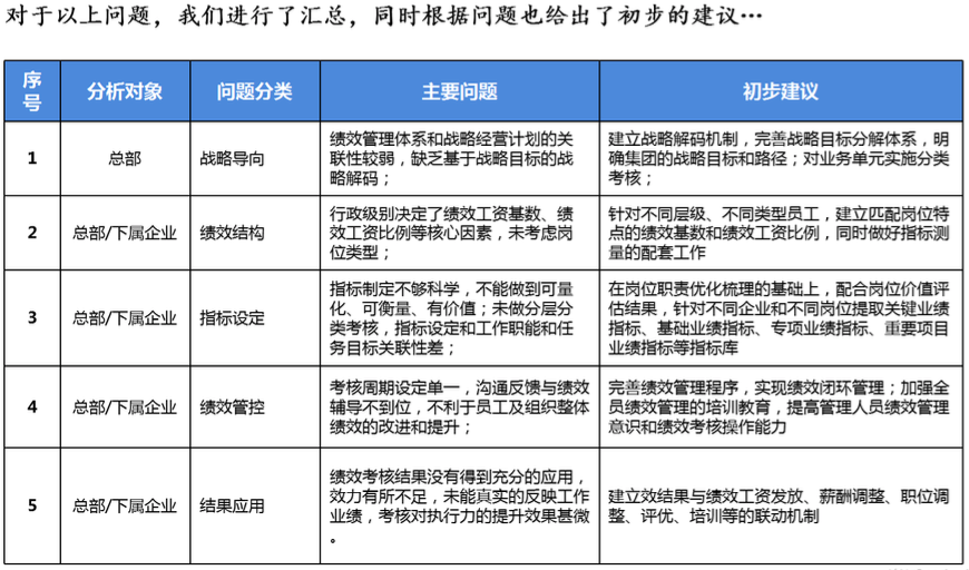 項(xiàng)目啟動(dòng)之初,通過(guò)內(nèi)部資料研究、企業(yè)深度訪談、員工調(diào)查問(wèn)卷、外部標(biāo)桿資料對(duì)比,政策研究等維度進(jìn)行全面診斷,發(fā)現(xiàn)問(wèn)題并提出改進(jìn)的思路。