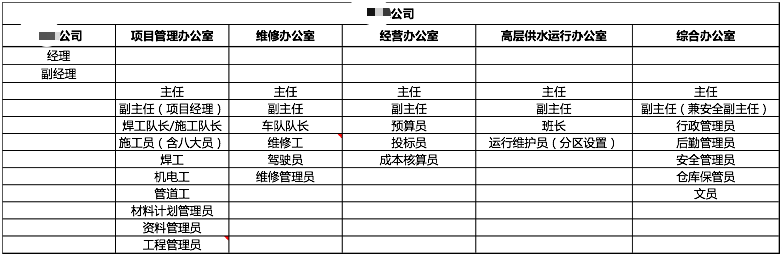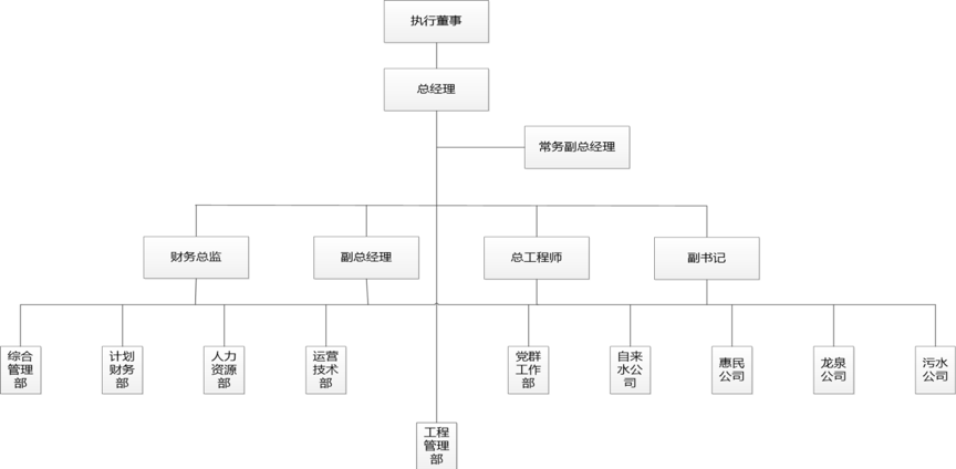新的管理團隊進入后,對原來的組織架構(gòu)進行了調(diào)整,形成 “5部4公司”的組織架構(gòu),即綜合管理部、計劃財務(wù)部、人力資源部、黨群工作部、運營技術(shù)部和自來水公司、惠民區(qū)域供水公司、XX建設(shè)工程公司、XX污水處理公司。