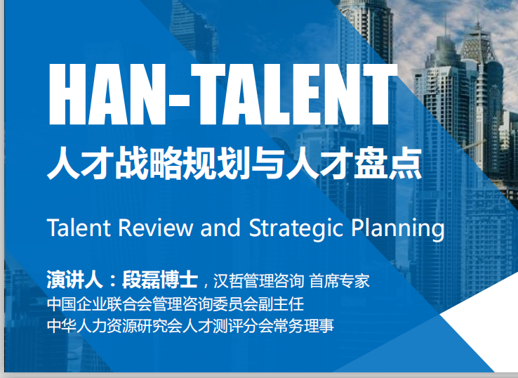 近年來,經(jīng)濟(jì)結(jié)構(gòu)轉(zhuǎn)型升級(jí)、科技創(chuàng)新層出不窮,各行各業(yè)都認(rèn)識(shí)到,需要重新認(rèn)識(shí)商業(yè)世界,需要對(duì)企業(yè)的未來進(jìn)行系統(tǒng)謀劃,而謀劃的重要內(nèi)容之一就是未來的人才與人才管理。有關(guān)于人才盤點(diǎn)、人力資源審計(jì)、人才戰(zhàn)略規(guī)劃,業(yè)內(nèi)有各種不同的說法,這三者之間是否有聯(lián)系,是怎樣的聯(lián)系和區(qū)別,作為企業(yè)如何運(yùn)用這些方法去規(guī)劃和指導(dǎo)人才管理實(shí)踐?帶著這些問題,本次論壇請(qǐng)到了中華人力資源研究會(huì)人才分會(huì)常務(wù)理事、北京大學(xué)人力資源開發(fā)與管理研究中心專家、中企聯(lián)管理咨詢委員會(huì)副主任委員、從事戰(zhàn)略人力資源體系建設(shè)與培訓(xùn)17年的實(shí)戰(zhàn)型專家段磊博士為大家剖析三個(gè)概念、講述三種方法、分享三個(gè)案例。