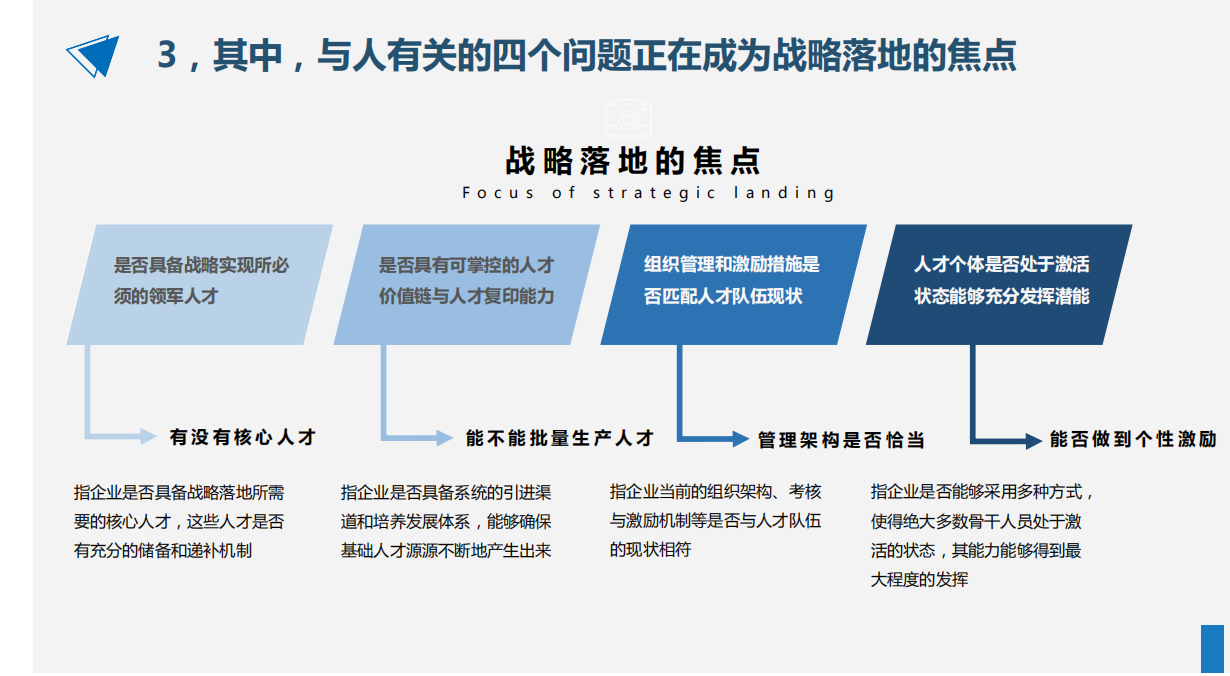 在人才管理策略規(guī)劃方面,強(qiáng)調(diào)以戰(zhàn)略為起點(diǎn),通過戰(zhàn)略解碼對(duì)人才管理任務(wù)進(jìn)行層層分解,針對(duì)每一項(xiàng)任務(wù),再具化為可落地、可操作、可衡量的重點(diǎn)工作,并借助于考核體系進(jìn)行目標(biāo)傳導(dǎo)和推動(dòng)。