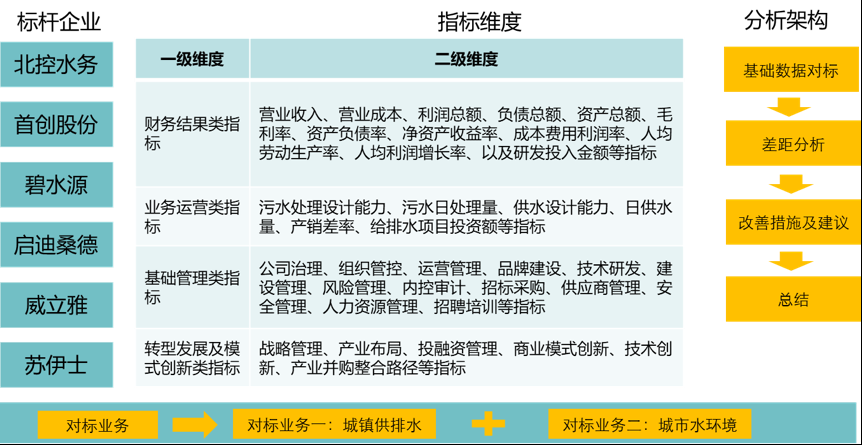 為實現(xiàn)客戶對標需求,結(jié)合客戶在水務(wù)行業(yè)的戰(zhàn)略規(guī)劃,確定了對標的業(yè)務(wù)類型。同時,與客戶溝通標桿企業(yè)選取原則,明確對標的企業(yè)范圍。在此基礎(chǔ)上,從多維度、立體化的系統(tǒng)性思維出發(fā),設(shè)置一級指標維度以及相應(yīng)的二級指標維度,形成對標的指標框架。最后,搜集相關(guān)數(shù)據(jù),結(jié)合對標分析架構(gòu),對各維度進行細化分析。
