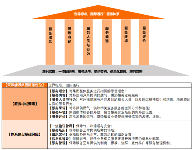 在服務(wù)體系框架搭建中,對(duì)集團(tuán)內(nèi)部服務(wù)燃?xì)?、供熱服?wù),以用戶體驗(yàn)為主線,進(jìn)行服務(wù)全生命周期梳理,并提煉了服務(wù)理念、服務(wù)內(nèi)容、服務(wù)人員與行為、服務(wù)渠道、服務(wù)環(huán)境、服務(wù)評(píng)價(jià)六大服務(wù)構(gòu)成要素,在此基礎(chǔ)上,搭建了能源服務(wù)保障體系框架。如下所示: