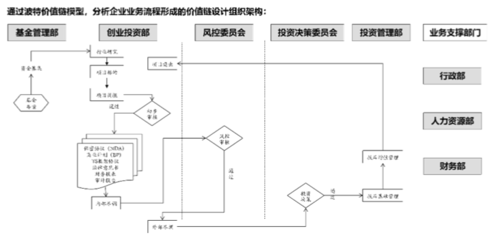 現(xiàn)代企業(yè)組織架構設計的基石——流程管理,建立波特價值鏈模型,通過分析基金投資企業(yè)業(yè)務流程形成的價值鏈來設計企業(yè)組織架構。邁克爾· 哈默:優(yōu)秀的流程將使成功的企業(yè)與其他競爭者區(qū)分開來,清晰的業(yè)務流程能理清組織架構關系和理順信息流程,為架構組織奠定基礎。