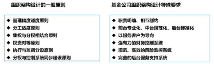 通過對標分析,發(fā)現(xiàn)在設計基金投資公司組織架構時除了遵循組織架構設計的一般原則外,還要符合基金行業(yè)的法規(guī)和規(guī)范。