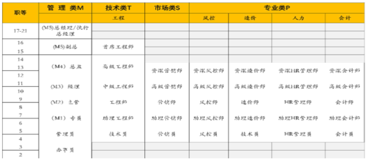 鑒于實業(yè)公司和實業(yè)公司發(fā)展基金目前發(fā)展階段的特點,由咨詢顧問進行崗位價值評價,得到《職等架構表》,職等架構重點體現(xiàn)在基金業(yè)務和項目運營管理業(yè)務上