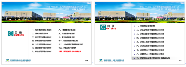在深入調(diào)研、嚴(yán)謹(jǐn)分析基礎(chǔ)上,全面撰寫(xiě)兩個(gè)《診斷報(bào)告》。《管理綜合診斷報(bào)告》從戰(zhàn)略發(fā)展、組織管控、研發(fā)管理、生產(chǎn)管理、營(yíng)銷管理、供應(yīng)管理、HSSE管理、財(cái)務(wù)管理、審計(jì)內(nèi)控、信息化管理、人力資源管理共計(jì)11個(gè)維度,對(duì)公司管理進(jìn)行了綜合診斷。并結(jié)合公司發(fā)展現(xiàn)狀,和最佳管理實(shí)踐,針對(duì)性的提出49個(gè)具體管理問(wèn)題,和8項(xiàng)綜合改進(jìn)舉措?!段幕\斷報(bào)告》從歷史視角、集團(tuán)要求、戰(zhàn)略視角、員工視角、評(píng)估視角、外部標(biāo)桿、管理運(yùn)行7個(gè)方面對(duì)企業(yè)文化進(jìn)行了全面的診斷分析。