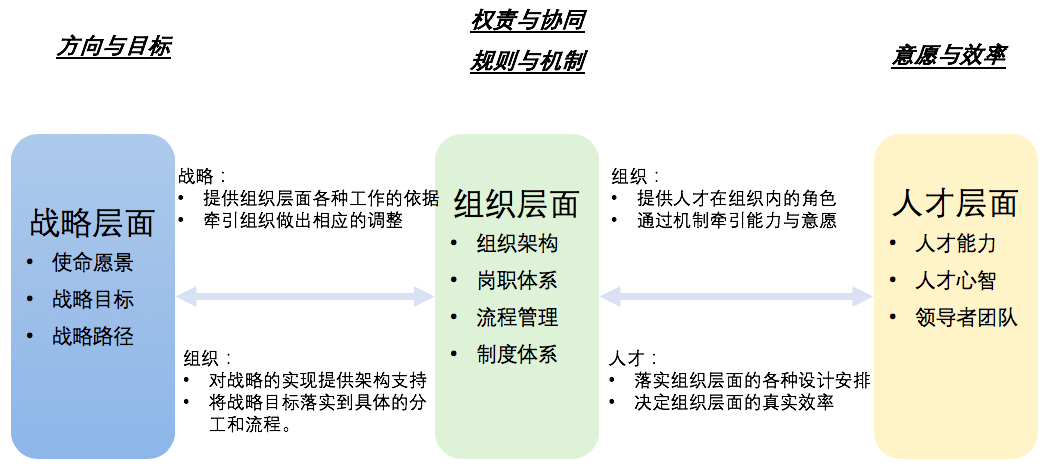 從上圖可見(jiàn),組織層面的各種設(shè)計(jì),組織架構(gòu)和管控,流程設(shè)計(jì)、各種制度,也包含人力資源相關(guān)的考核、薪酬、干部管理、勞動(dòng)關(guān)系與用工、招聘配置等等的具體規(guī)則,既承接了戰(zhàn)略目標(biāo),為具體的戰(zhàn)略實(shí)現(xiàn)服務(wù),也需要隨著戰(zhàn)略的調(diào)整而調(diào)整,同時(shí),組織層面的各種設(shè)計(jì),也決定了對(duì)人才的具體角色要求,角色要求既代表著對(duì)人才標(biāo)準(zhǔn)的要求,同時(shí)也通過(guò)各種流程制度形成機(jī)制牽引著人才能力的發(fā)揮和心智的改善,當(dāng)然,人才層面的各種要素的表現(xiàn)水平也直接影響者組織層面各種設(shè)計(jì)的實(shí)際運(yùn)行效率,并且有可能倒逼組織層面進(jìn)行相應(yīng)的調(diào)整,比如人才能力不能支持組織層面的設(shè)計(jì),或組織層面的設(shè)計(jì)無(wú)法充分發(fā)揮人才的能力時(shí)。所以人才管理體系設(shè)計(jì)的重點(diǎn)就在于如何在組織層面通過(guò)制度設(shè)計(jì),配合相應(yīng)的工具方法,最終在人才層面達(dá)到想要的結(jié)果,從而將戰(zhàn)略層面與人才層銜接起來(lái)。