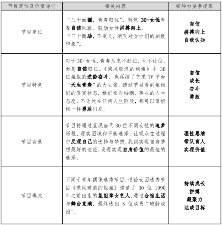 而在此背景下,參加節(jié)目的30位“小姐姐”的身上,尤其是每次分組選取的團(tuán)隊(duì)leader的身上更應(yīng)該體現(xiàn)與其價值定位相適應(yīng)的的領(lǐng)導(dǎo)力要素,從而使其帶領(lǐng)的團(tuán)隊(duì)能無限放大節(jié)目傳遞的價值觀。