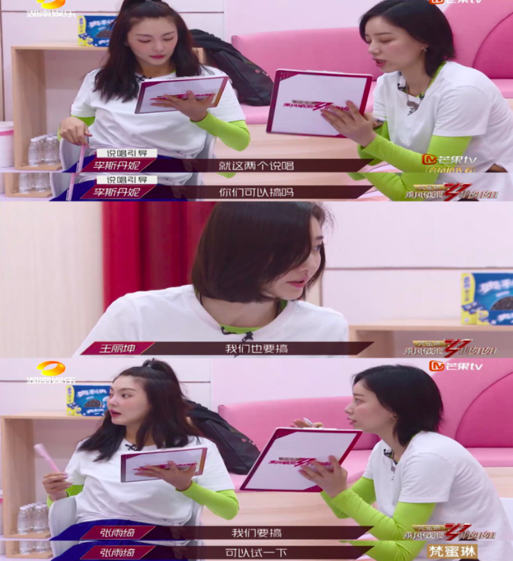 情景10:張雨綺組里有兩個演員,讓這個組有著極大的短板。面對公演曲目中的兩段RAP,在專業(yè)的李斯丹妮提出要不要挑戰(zhàn)的時候,張雨綺立即說“我們要搞”,并帶動并不自信的王麗坤勇敢地邁出第一步。