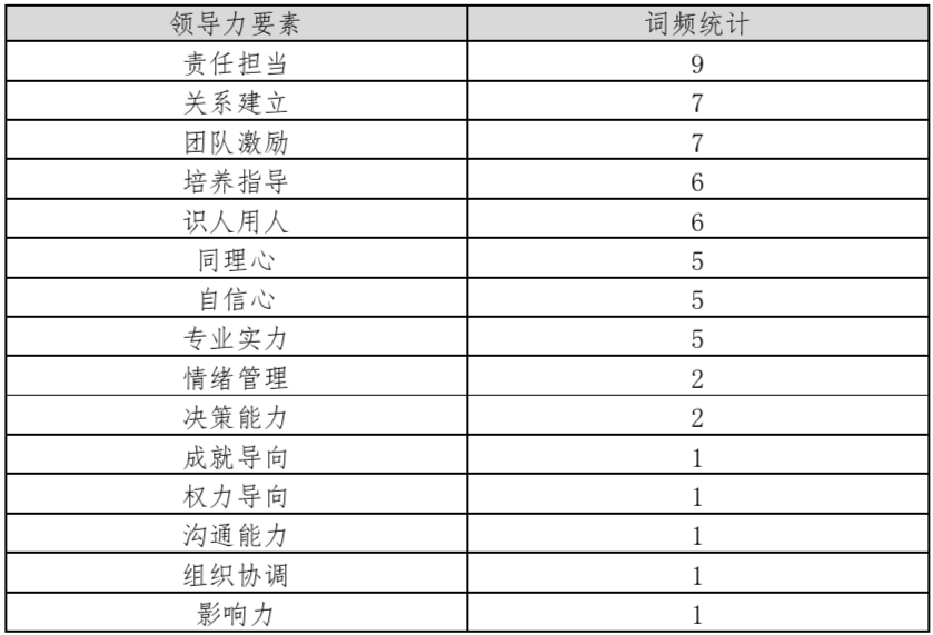 將出現(xiàn)頻率較高的要素提取出來為: 責(zé)任擔(dān)當(dāng)、關(guān)系建立、團(tuán)隊(duì)激勵、培養(yǎng)指導(dǎo)、識人用人、同理心、自信心、專業(yè)實(shí)力。