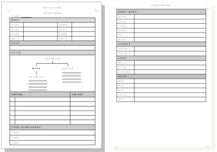 結(jié)合以上分析,參照外部對標(biāo)企業(yè)崗位設(shè)置,最終確定崗位設(shè)置方案。按照確定的崗位說明書模板與編撰原則,制定《崗位說明書》。