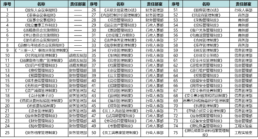 公司領(lǐng)導(dǎo)、各部門與項目組對制度體系框架(制度分類、制度清單、制度主要內(nèi)容范圍、主責(zé)部門等)進(jìn)行反復(fù)討論,設(shè)計了涵蓋12大類、75項制度的整體框架,確保公司制度體系能夠覆蓋公司所有主要業(yè)務(wù)管理活動,并避免制度之間的沖突、交叉與空白。