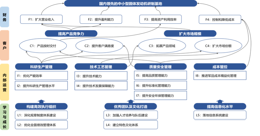 研究所制定《十四五發(fā)展規(guī)劃》,明確發(fā)展目標(biāo)和重點(diǎn)方向,保障戰(zhàn)略目標(biāo)的有效執(zhí)行是重點(diǎn),根據(jù)研究所的總體戰(zhàn)略目標(biāo),借助平衡計(jì)分卡,從財(cái)務(wù)、客戶、內(nèi)部運(yùn)營、學(xué)習(xí)與成長四個(gè)方面對(duì)戰(zhàn)略目標(biāo)進(jìn)行逐層分解,形成若干戰(zhàn)略主題,通過各部門梳理和討論,最終確定研究所戰(zhàn)略地圖。
