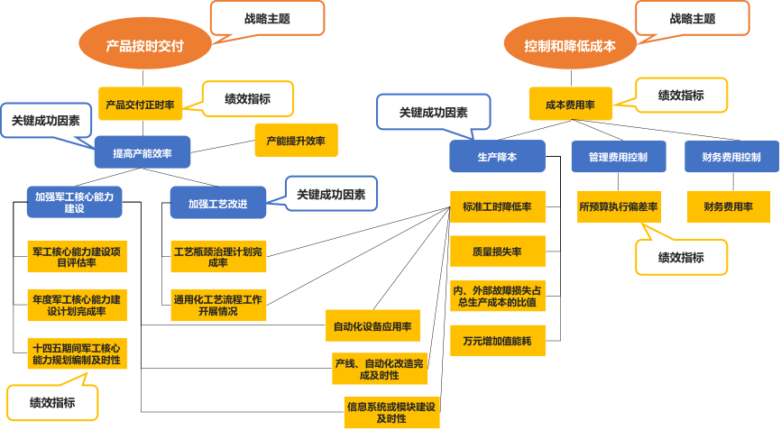 從戰(zhàn)略目標(biāo)出發(fā),層層梳理戰(zhàn)略主題、關(guān)鍵成功因素與指標(biāo)的邏輯關(guān)系,同時(shí)分析指標(biāo)間相互影響關(guān)系,進(jìn)一步識(shí)別影響戰(zhàn)略目標(biāo)的核心績效指標(biāo)。通過繪制樹狀的指標(biāo)關(guān)系圖,明確各個(gè)指標(biāo)與戰(zhàn)略的相關(guān)性,以此判斷指標(biāo)的戰(zhàn)略重要性,并根據(jù)指標(biāo)與其他指標(biāo)的關(guān)系判斷該指標(biāo)的影響范圍,幫助管理者定位需關(guān)注的關(guān)鍵領(lǐng)域。通過指標(biāo)關(guān)系圖可明確指標(biāo)的戰(zhàn)略重要性及影響度,以此為參考篩選核心指標(biāo)。
