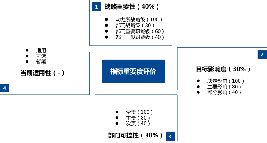從戰(zhàn)略重要性、目標(biāo)影響度、部門可控性、當(dāng)期適用性四個(gè)維度建立指標(biāo)評(píng)價(jià)模型,由考核工作小組對(duì)各部門績效指標(biāo)進(jìn)行初次評(píng)價(jià),各部門負(fù)責(zé)人進(jìn)行復(fù)評(píng),選取評(píng)分排名靠前的指標(biāo)作為當(dāng)期部門績效考核指標(biāo),最終由考核領(lǐng)導(dǎo)小組審核確認(rèn)入選指標(biāo)。入選指標(biāo)每年由考核工作小組根據(jù)當(dāng)年實(shí)際工作進(jìn)行動(dòng)態(tài)更新,如研究所戰(zhàn)略或工作目標(biāo)發(fā)生調(diào)整,則需重新進(jìn)行指標(biāo)評(píng)價(jià)。