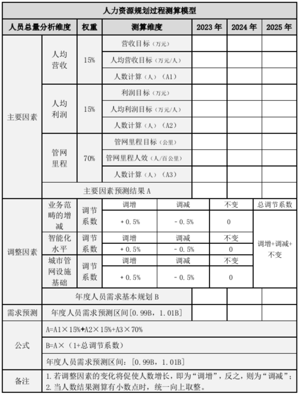 排水公司的人員需求規(guī)劃模型由三個(gè)主要因素和三個(gè)調(diào)整因素兩部分構(gòu)成。主要因素包括人均營(yíng)收、人均利潤(rùn)、管網(wǎng)里程;調(diào)整因素包括業(yè)務(wù)范疇的增減、智能化水平、城市管網(wǎng)設(shè)施基礎(chǔ)。