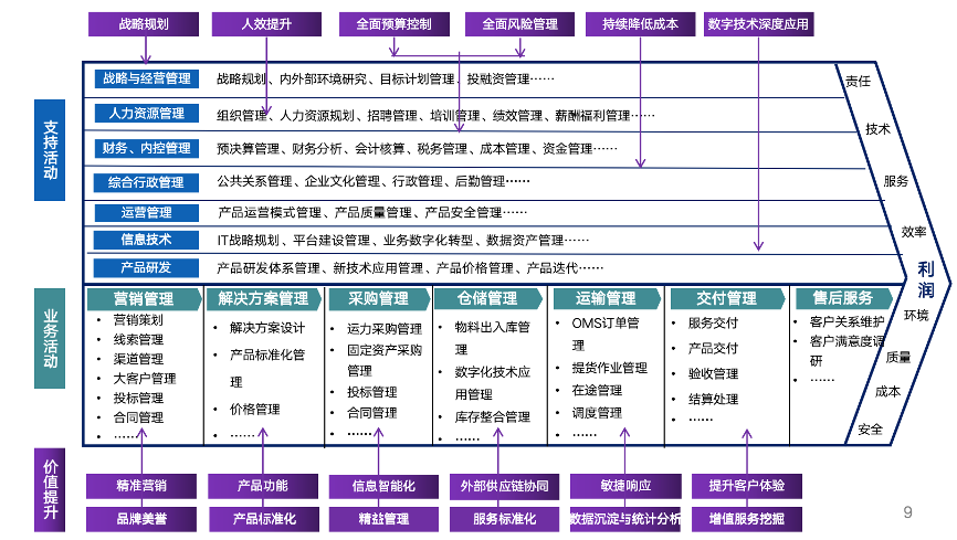 企業(yè)價值鏈?zhǔn)崂硎枪芾眢w系建設(shè)的重要依據(jù),通過將企業(yè)創(chuàng)造價值的活動拆分,識別并強(qiáng)化能夠?yàn)槠髽I(yè)帶來競爭優(yōu)勢的戰(zhàn)略活動,建立企業(yè)核心能力,以此來規(guī)劃企業(yè)管理體系的總框架。