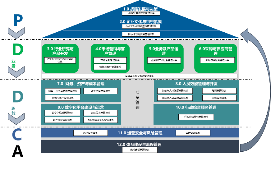 該企業(yè)管理體系梳理思路以“PDCA循環(huán)”理論為依據(jù),建立了體系層面的動態(tài)持續(xù)提升機(jī)制。其中,戰(zhàn)略與文化為引領(lǐng),屬于規(guī)劃層;目標(biāo)計(jì)劃預(yù)算活動為銜接;業(yè)務(wù)活動與支持類活動為執(zhí)行層,風(fēng)控與審計(jì)職能模塊為監(jiān)督檢查層,體系建設(shè)與流程管理為改善提升層。體系建設(shè)規(guī)劃以支撐企業(yè)經(jīng)營管理為目標(biāo),以持續(xù)提升改善為要求。