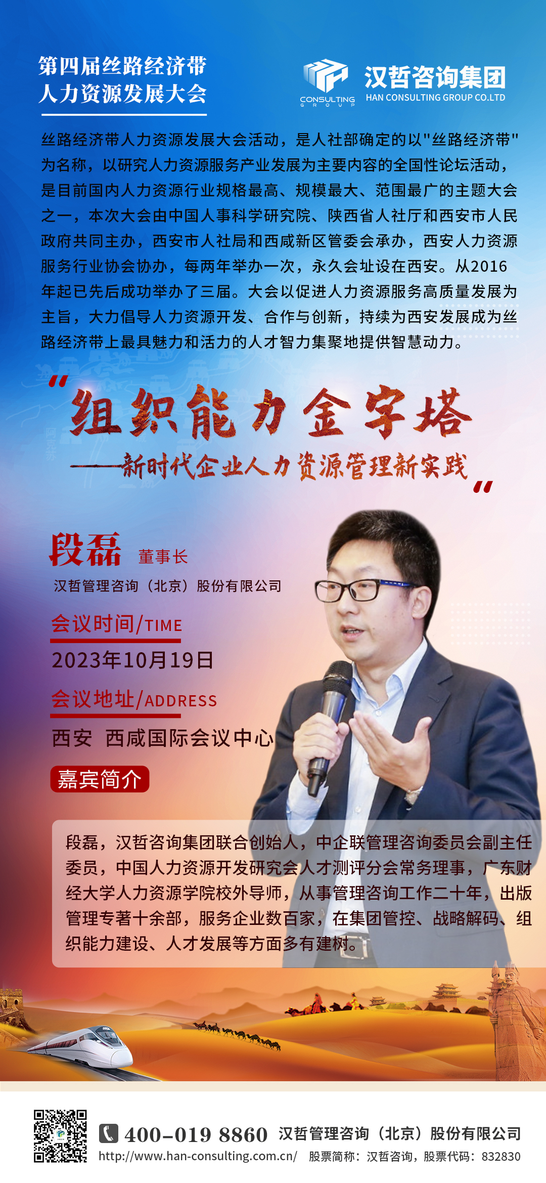 漢哲咨詢創(chuàng)始人段磊博士受邀參加本次盛會,并為與會嘉賓做題為《組織能力金字塔-新時代企業(yè)人力資源管理新實踐》的專題演講,組織能力金字塔(POC),是漢哲咨詢首創(chuàng)并付諸于企業(yè)實踐的一套系統(tǒng)、科學(xué)的組織與人才建設(shè)解決方案,將文化、戰(zhàn)略、組織、流程、人才管理與開發(fā)、數(shù)字化等多個元素有機融合,打破了傳統(tǒng)人力資源管理方法的邊界和局限,將“人“放到戰(zhàn)略、文化、組織的大視野、大環(huán)境中去配置、去使用、去開發(fā)、去評價、去激勵,是人力資源管理第五代方法論的集大成者,在若干企業(yè)的實戰(zhàn)應(yīng)用中,也取得了突出的成效。本次盛會,段磊博士將代表漢哲咨詢,以案例的形式,系統(tǒng)介紹這套面向新時期的組織與人才系統(tǒng)解決方案。