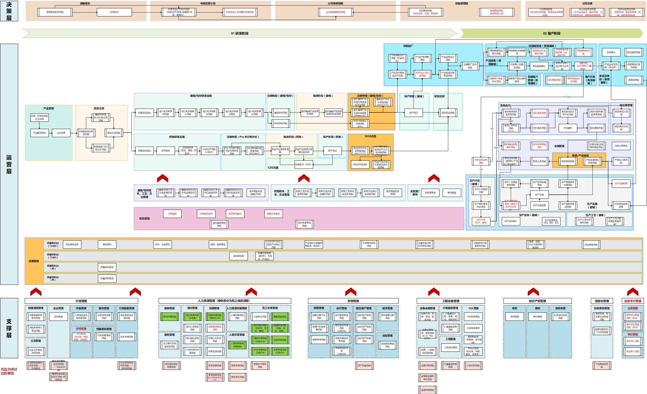 1.確定“3層2階段”的流程框架。3層-戰(zhàn)略層、運(yùn)營層、支撐層;2階段-研發(fā)階段、量產(chǎn)階段。下圖為邏輯框架: