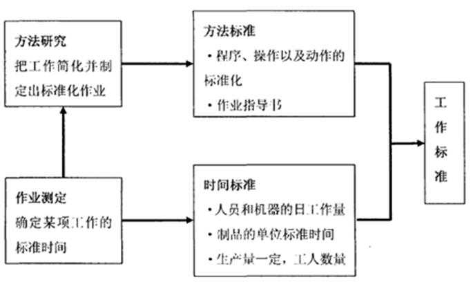 其中:方法研究和作業(yè)測定是工業(yè)領(lǐng)域的兩大技術(shù)。作業(yè)測定是方法研究的基礎(chǔ),方法研究是在現(xiàn)有作業(yè)(作業(yè)測定后制定的新的標準作業(yè))的基礎(chǔ)上,對其方法進行研究分析,尋求最合理的作業(yè)順序,并用來制定新的作業(yè)方法,方法研究的目的是為作業(yè)測定提供研究的基礎(chǔ),它包括程序分析、操作分析和動作分析;方法研究作為作業(yè)測定的基礎(chǔ),作業(yè)測定是在新方法(方法研究改善后的新方法)的基礎(chǔ)上,對作業(yè)單元進行研究分析,確定各項作業(yè)的標準作業(yè)時間,并編制作業(yè)指導書,作為一種指導方法,作業(yè)測定的目的是便于方法研究的改善,它包括秒表時間研究、工作抽樣、預定時間法和標準資料法。