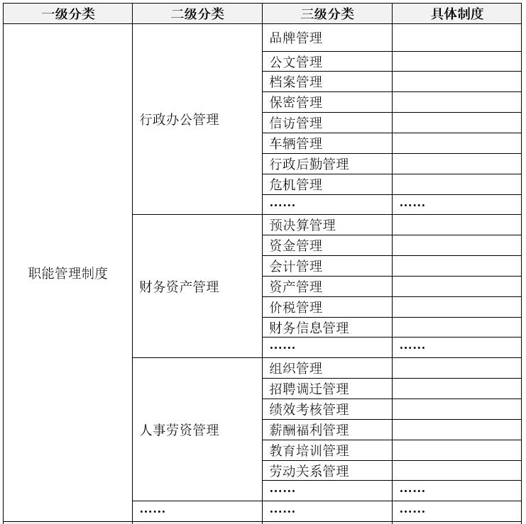 根據(jù)企業(yè)的管理職能,可以確定職能管理制度的分類(lèi),一般來(lái)講,企業(yè)的核心職能包括戰(zhàn)略管理、計(jì)劃管理、風(fēng)險(xiǎn)管理、資產(chǎn)運(yùn)營(yíng)、財(cái)務(wù)管理、審計(jì)監(jiān)察、內(nèi)部控制、人力資源管理、信息資源管理、公共關(guān)系管理、基本建設(shè)管理、黨群工作、精神文明建設(shè)和企業(yè)文化建設(shè),等等。當(dāng)然,每個(gè)企業(yè)的職能不盡相同,這就需要根據(jù)職能的關(guān)鍵性、職能相關(guān)制度的數(shù)量等因素確定制度模塊的數(shù)量和名稱(chēng),力求做到無(wú)交叉、無(wú)遺漏、無(wú)重復(fù),使之涵蓋管理職能的方方面面。