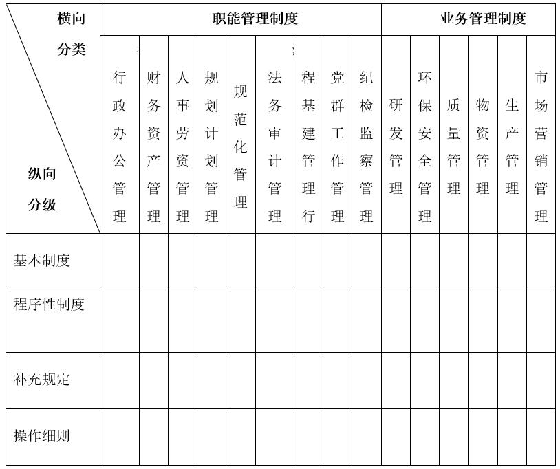 結(jié)合職能設(shè)置、管理流程的梳理以及內(nèi)外部制度環(huán)境的影響,對(duì)單體企業(yè)層面制度進(jìn)行橫向分類(lèi)。橫向分類(lèi)劃分為:支持管理制度、業(yè)務(wù)管理制度2個(gè)一級(jí)分類(lèi),還可以進(jìn)一步細(xì)分為二級(jí)制度分類(lèi)、三級(jí)制度分類(lèi)。根據(jù)管理制度的細(xì)分,需要對(duì)管理制度分類(lèi)層層細(xì)化,力求做到無(wú)交叉、無(wú)遺漏、無(wú)重復(fù),使之涵蓋管理的方方面面。根據(jù)一類(lèi)職能中工作流程的先后順序?qū)υ撀毮苓M(jìn)行橫向細(xì)分,將相似、相近、相關(guān)的經(jīng)營(yíng)管理活動(dòng)歸并為一類(lèi)職能;其次,對(duì)于該項(xiàng)職能中比較重要的下一級(jí)細(xì)分職能可以根據(jù)管理的需要提升到與其同等的層次。