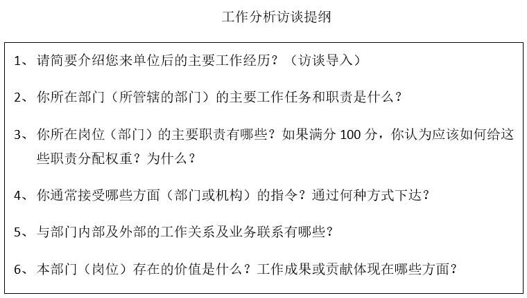根據(jù)事先設(shè)定的訪談量表對(duì)崗位上的任職人員、崗位的直接主管、崗位經(jīng)常進(jìn)行工作接觸的人員就該崗位的工作內(nèi)容、任職條件、工作關(guān)系、工作環(huán)境等進(jìn)行交流溝通,并作記錄的過程。