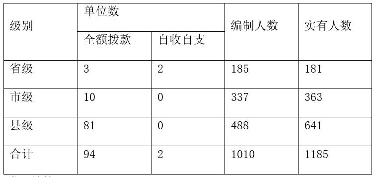 藥監(jiān)系統(tǒng)包含了省屬、市屬和縣屬事業(yè)單位。省屬事業(yè)單位共有5個(gè),從經(jīng)費(fèi)來(lái)源看,其中3個(gè)為全額撥款事業(yè)單位,2個(gè)為自收自支事業(yè)單位;市屬事業(yè)單位10個(gè),縣屬事業(yè)單位81個(gè),全部為全額撥款事業(yè)單位。如表所示:
