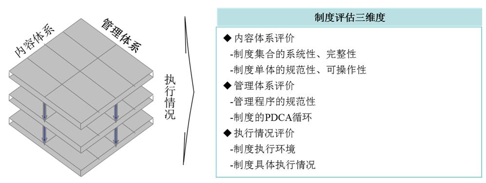 對于制度管理體系的評估,通常從宏觀管理(企業(yè)總體制度管理)、中觀管理(專項職能制度管理)和微觀管理(單體制度管理)三個層面進行分類評估,每個層面評估工作的側(cè)重點不同,其中: