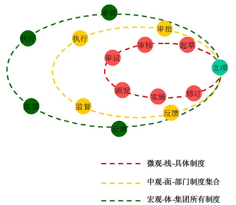 制度建設(shè)是一個復(fù)雜的系統(tǒng)工程,它由宏觀、中觀、微觀三個循環(huán)體系構(gòu)成(見圖1),外部層次循環(huán)遞進指導(dǎo)內(nèi)部層次循環(huán)的建設(shè)方向,內(nèi)部層次循環(huán)影響外部層次的執(zhí)行效果。微觀循環(huán)是單一制度的生命周期管理,指一個制度從立項、制定到廢止的閉環(huán)管理過程;中觀循環(huán)是各職能部門對相應(yīng)制度集合的管理,體現(xiàn)具體部門職能面的工作;宏觀循環(huán)是指企業(yè)作為一個整體,對其全部制度的運行管理。宏觀循環(huán)指導(dǎo)中觀循環(huán)的方向,中觀循環(huán)確定微觀循環(huán)的主體,各個循環(huán)由體到面、由面到條線、由條線到點,形成一個自我約束的管理體系。