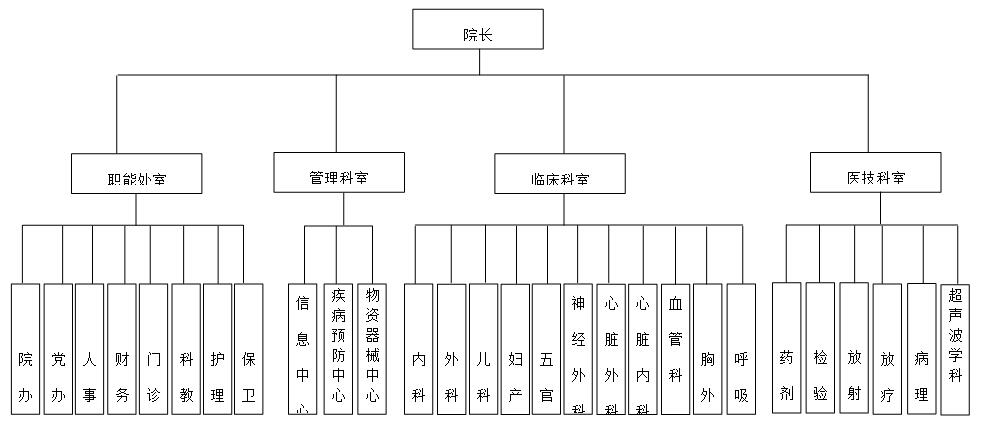 N醫(yī)院成立于1990年,是以治療心肺血管疾病為重點(diǎn)的大型綜合性醫(yī)院。醫(yī)院占地面積5萬(wàn)平方米,醫(yī)療用房9萬(wàn)平方米。現(xiàn)有職工近1000人,其中高級(jí)專業(yè)技術(shù)人員100余人。臨床、醫(yī)技科室15個(gè),床位500余張。具有現(xiàn)代化設(shè)施和人文理念的心胸血管外科大樓,具有百、萬(wàn)級(jí)凈化層流手術(shù)室20間,術(shù)后監(jiān)護(hù)病床30張,新建的門診綜合樓2.8萬(wàn)平方米,為患者提供的人性化醫(yī)療服務(wù)。心臟外科、心臟內(nèi)科、血管科、胸外科、呼吸內(nèi)科是醫(yī)院的重點(diǎn)特色科室,醫(yī)院的組織結(jié)構(gòu)圖如下: