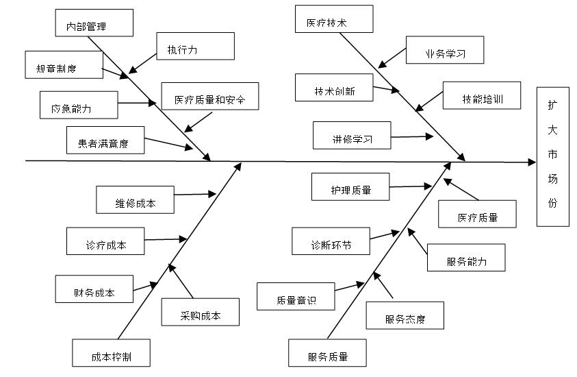根據(jù)醫(yī)院的戰(zhàn)略,采用“魚骨圖”分析的辦法進(jìn)行了戰(zhàn)略指標(biāo)的分解。
