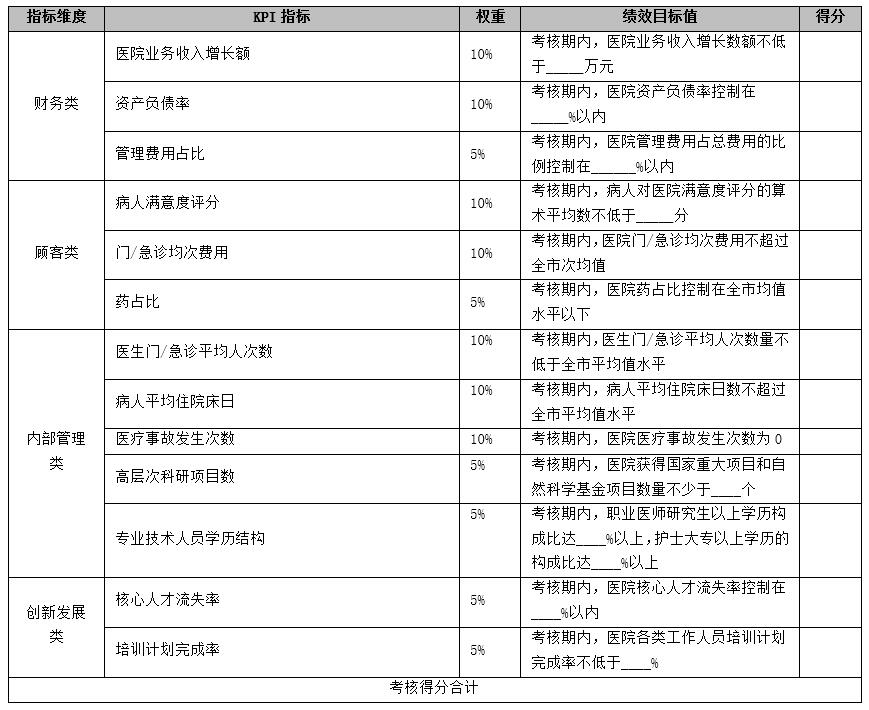 根據(jù)KPI指標(biāo)以及崗位職責(zé),形成了各個(gè)崗位的績(jī)效考核指標(biāo),由于崗位眾多,選取該醫(yī)院院長(zhǎng)的考核指標(biāo)作為范例。