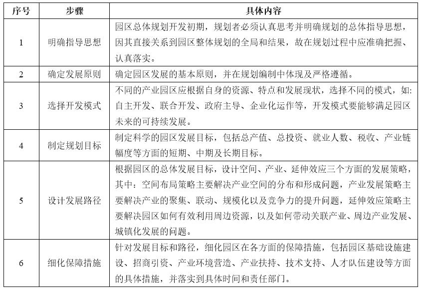 針對上述問題,各產(chǎn)業(yè)園區(qū)都在探索各自的發(fā)展道路,如:爭取政策支持、產(chǎn)城融合、突出技術(shù)優(yōu)勢,等等。通常來看,產(chǎn)業(yè)園區(qū)規(guī)劃大致包括如下六大步驟,如下表所示: