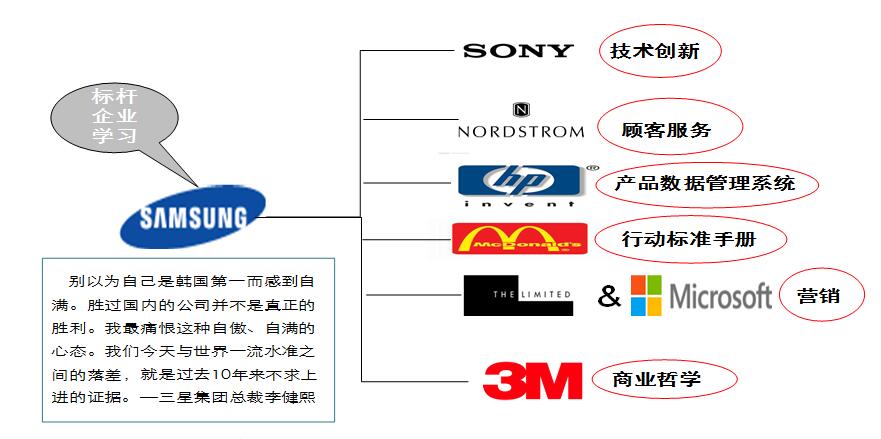 李健熙在1987年就任三星董事長之后 ,立刻診斷出三星的病癥,即“韓國國內(nèi)第一”的自滿心態(tài),對于世界市場到底有多廣、多高缺乏必要的認知。在此基礎(chǔ)上,三星開始了針對全球領(lǐng)先企業(yè)的對標與學(xué)習(xí)工作。