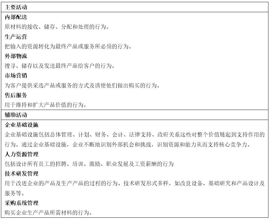 表3列出了用來評(píng)價(jià)企業(yè)主要和輔助活動(dòng)的價(jià)值創(chuàng)造能力的要素。在利用這個(gè)表格進(jìn)行評(píng)價(jià)時(shí),應(yīng)與競(jìng)爭(zhēng)對(duì)手的相應(yīng)能力進(jìn)行比較。要想成為企業(yè)競(jìng)爭(zhēng)優(yōu)勢(shì)的一種來源,某種資源或能力必須以優(yōu)于競(jìng)爭(zhēng)對(duì)手的方式來執(zhí)行,或以一種競(jìng)爭(zhēng)對(duì)手無法做好、無法模仿的方式來執(zhí)行。只有如此,企業(yè)才能更高效地為顧客創(chuàng)造價(jià)值,從而擁有收獲這種價(jià)值的機(jī)會(huì)。
